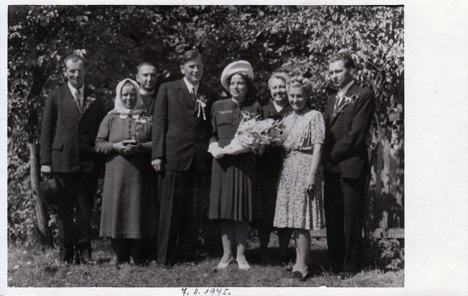 Popis fotografie: svatba Emilie Verostové a Eduarda Chvátala, zleva Eduardův bratr Josef, jeho žena Marie, farář Humpolec, Eduard a Emilie, nevlastní matka Emilie – Františka Verostová, Maněnka Schützová, nevlastní bratr Vlastimil Verosta