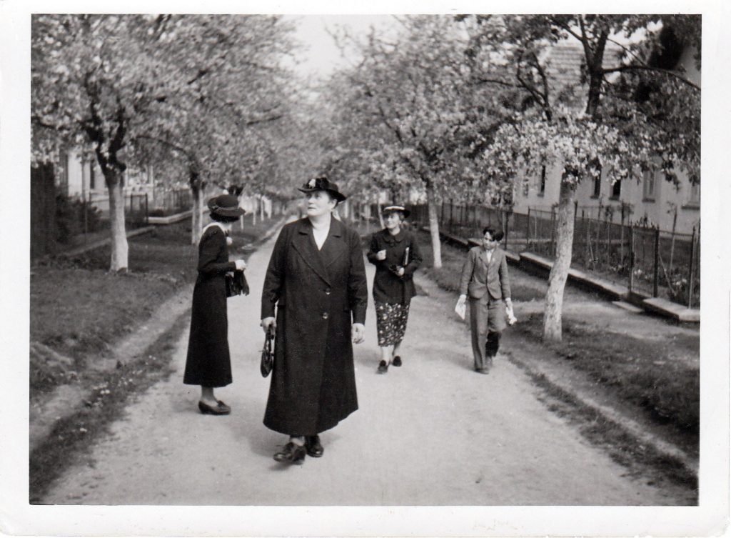 Popis fotografie: cestou na pouť na Floriánku, zleva Emilie Verostová, pí Chrostková, Maněnka Schützová (asi 1909-1948), náhodný kolemjdoucí
