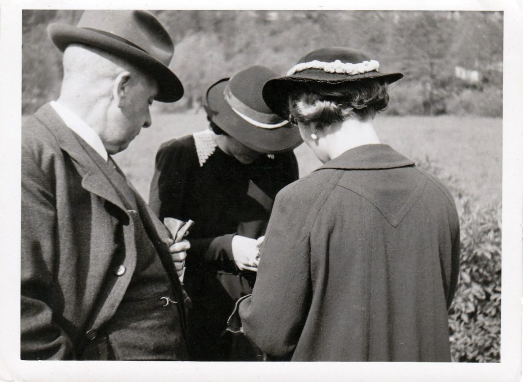 Popis fotografie: cestou na pouť na Floriánku, zleva p. Chrostek, Emilie Verostová, Maněnka Schützová