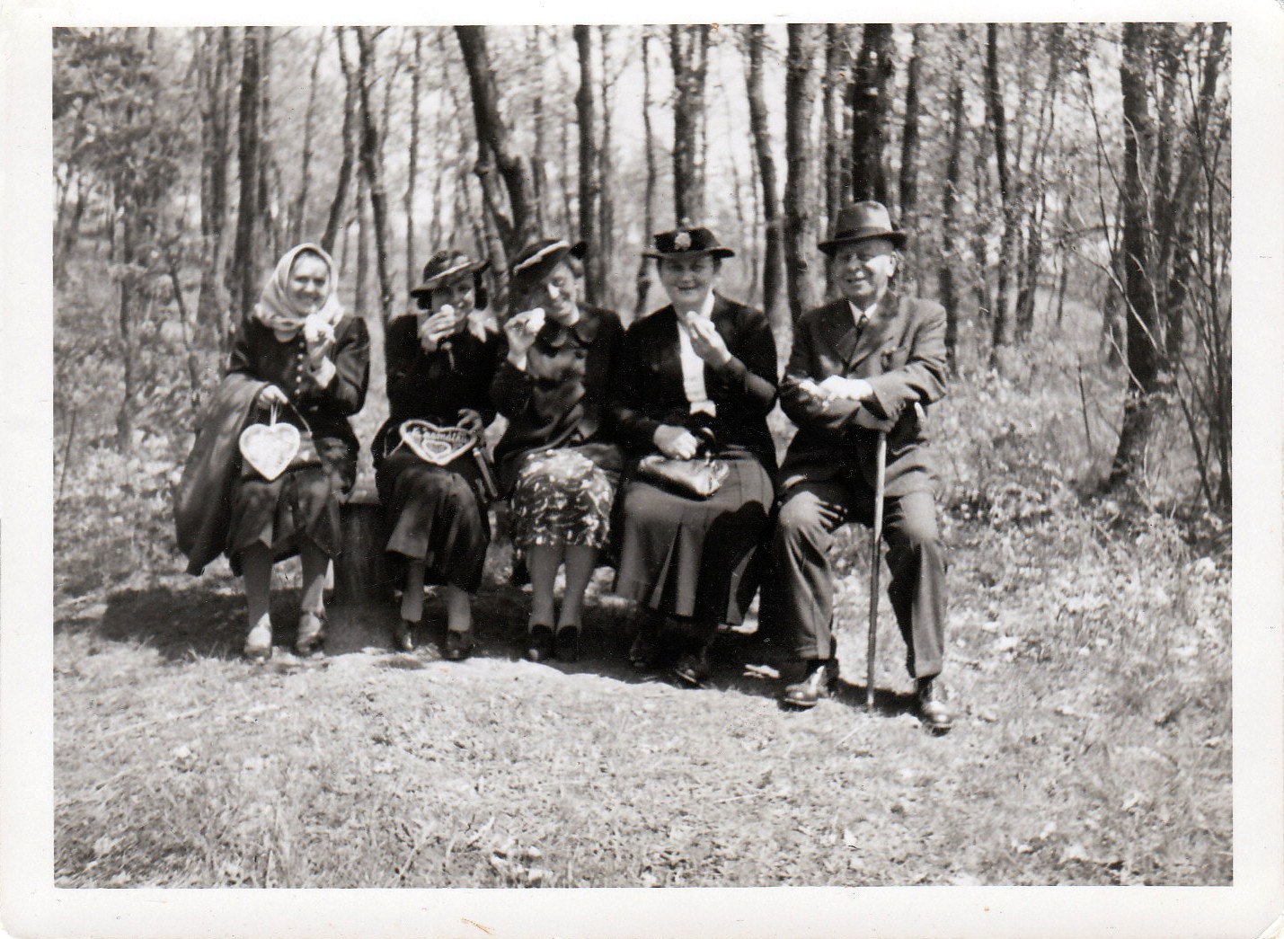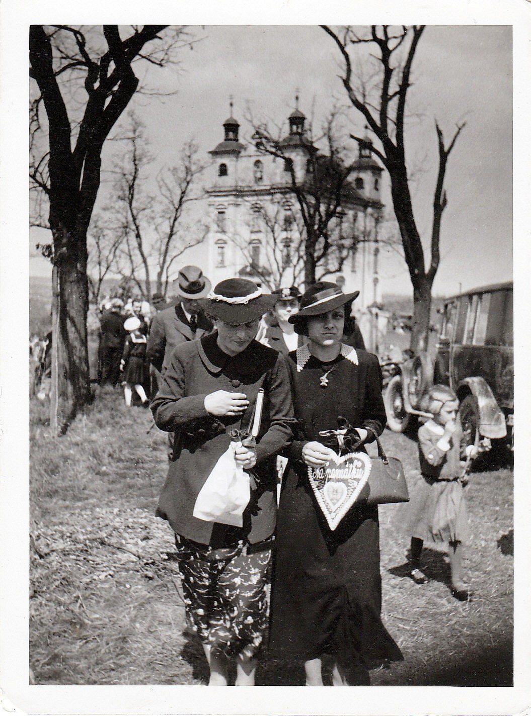 Popis fotografie: pouť na Floriánku, zleva Maněnka Schützová, Emilie Verostová, za nimi pan a paní Chrostkovi