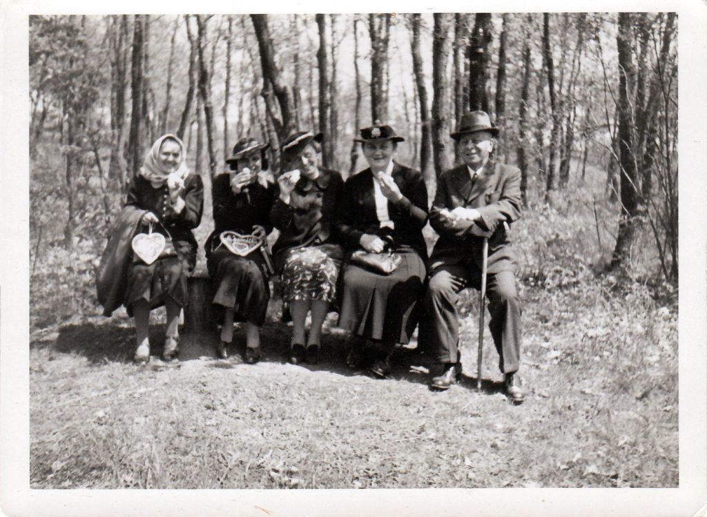 Popis fotografie: pouť na Floriánku, zprava pan a paní Chrostkovi, jejich dcera Maněnka vd. Schützová, Emilie Verostová, Julie ? (pozdější chůva syna Emilie Verostové Ivana)