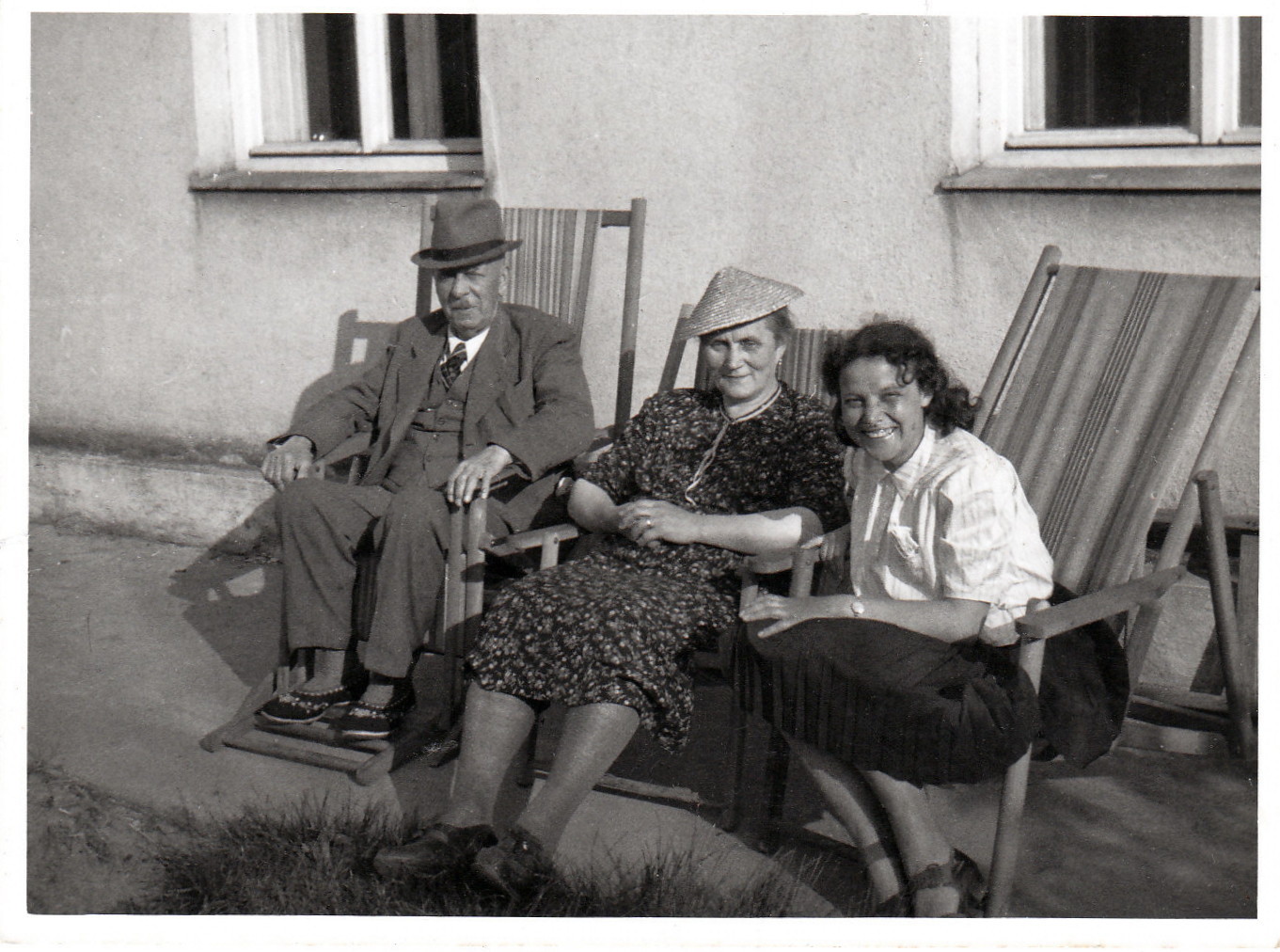 Popis fotografie: zleva Maněnka a Otakar Schützovi, Emilie Verostová
