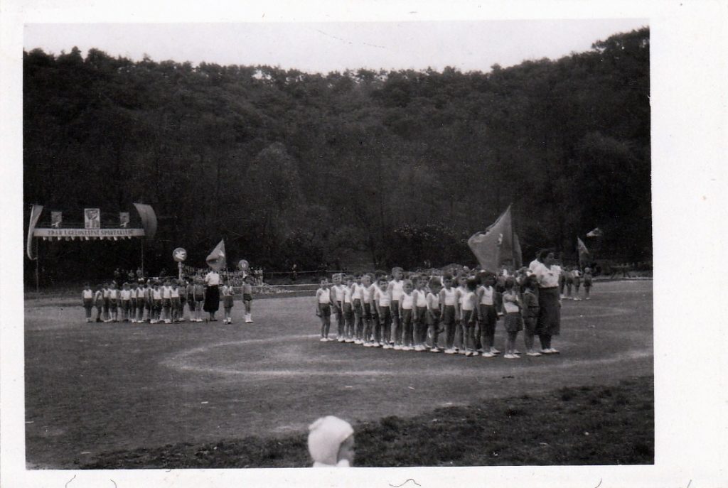 Popis fotografie: spartakiáda, cvičení školních dětí „Zlatá brána“, vpředu vpravo uč. Emilie Chvátalová