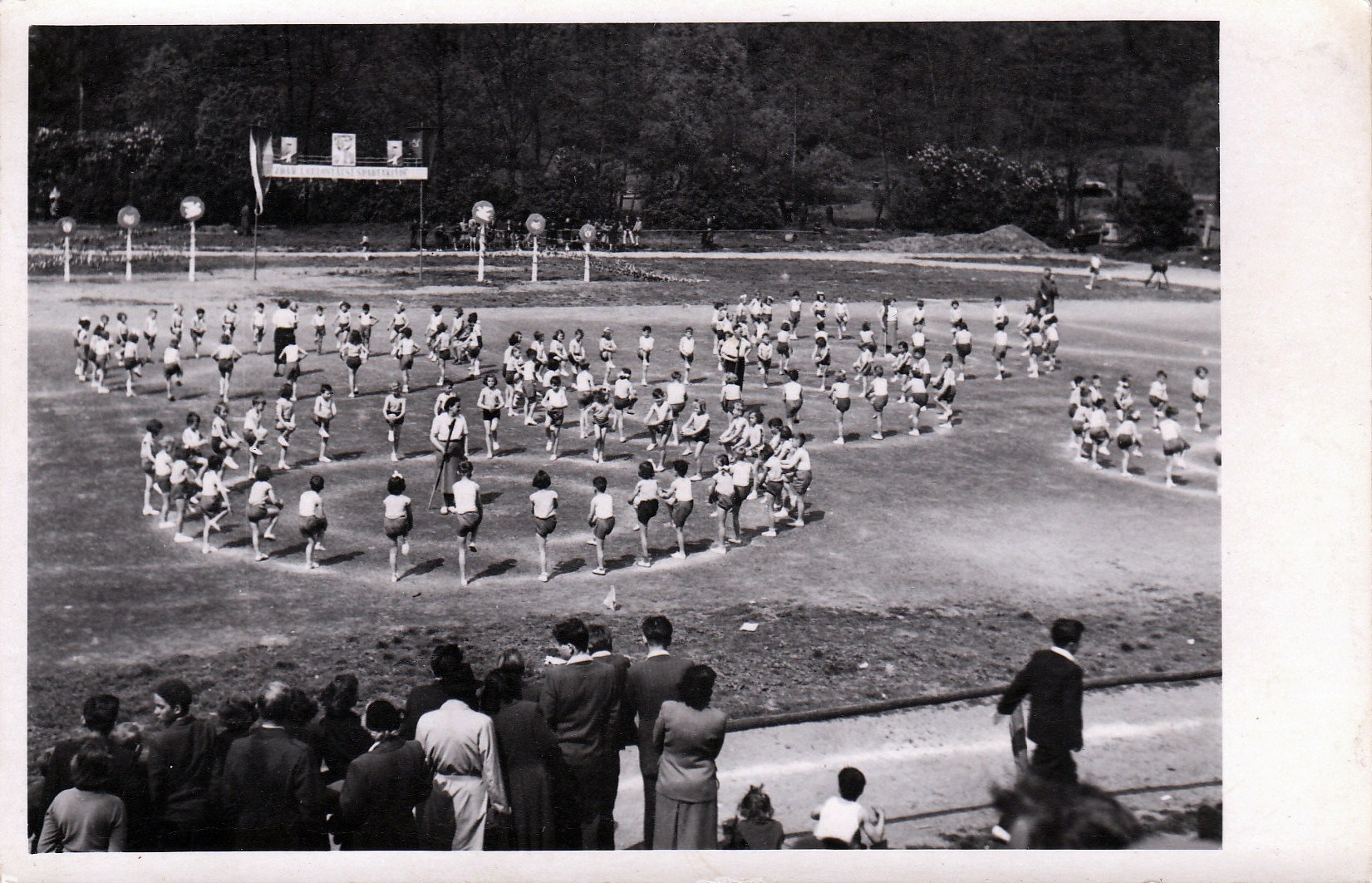 Popis fotografie: spartakiáda, cvičení školních dětí „Zlatá brána“, v popředí v kruhu uč. Emilie Chvátalová