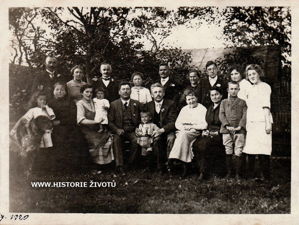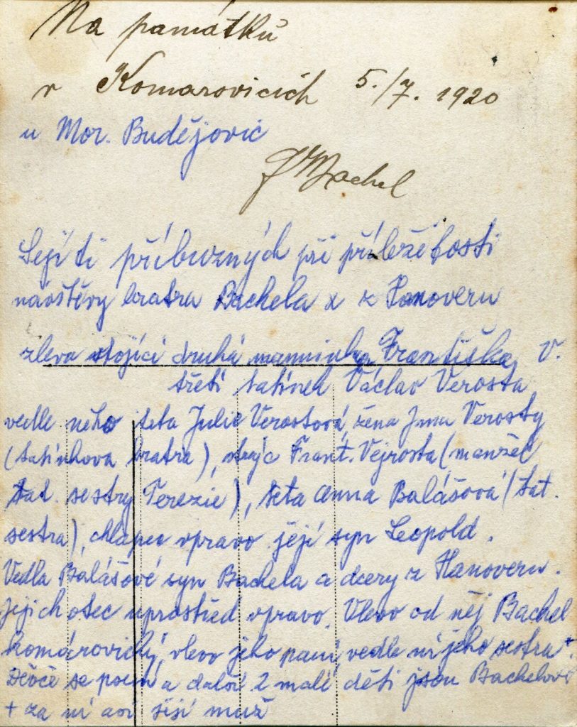 Popis fotografie: setkání příbuzných při příležitosti návštěvy bratrance Václava Verosty (*1875). Tento bratranec Bachel žijící v Hanoveru navštívil svého bratra Antonína Bachela, žijícího v Komárovicích a při té příležitosti se sešlo široké příbuzenstvo.