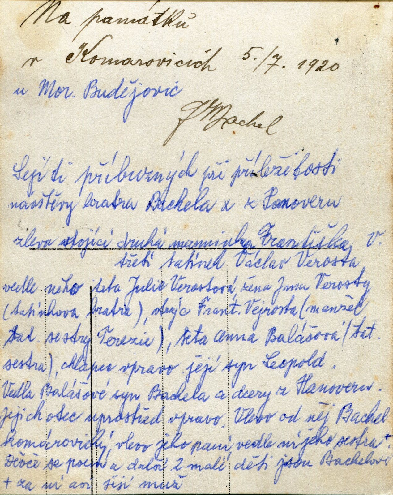 dole uprostřed bratři (zleva) Antonín (z Komárovic) a ? (z Hanoveru) Bachelové, bratranci Václava Verosty (*1875) z Moravského Krumlova (třetí zleva v horní řadě), vedle Václava vlevo jeho druhá žena Františka (1896-1976). Čtvrtá zleva v horní řadě Julie Verostová (rozená Košíčková z Rybníků, žena Václavova bratra Jana Verosty (*1891)), vedle František Vejrosta, druhý manžel Václavovy sestry Theresie (*1892), vedle další Václavova sestra Anna Balášová (*1888), dále René Bachel z Hanoveru a jeho dvě sestry. V první řadě je vlevo od Antonína Bachela jeho žena, drží v náručí jejich dítě, dalšími jsou dívka se psem a syn stojící mezi bratry Bachelovými, další vlevo je sestra Antonína Bachela a nad ní její muž. Zcela vpravo je syn Anny Balášové Leopold. Vpravo od Bachela hanoverského by mohla být jeho žena.