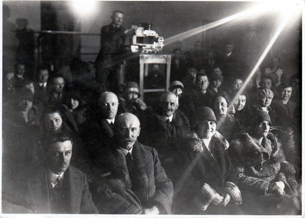 Popis fotografie: Václav Verosta (*1875) uprostřed před stoličkou s promítacím přístrojem