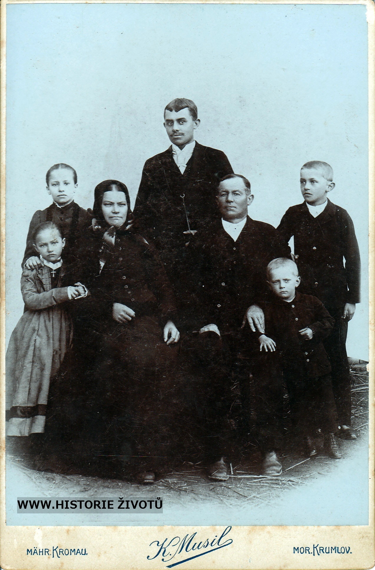 Popis fotografie: Václav (*1844) a Teresia (*1852) Verostovi se svými dětmi: zleva Anna (1888-195?), Theresia (1882-?), Václav (1875-1934), Jan (1891-?), Antonín (1885-?)