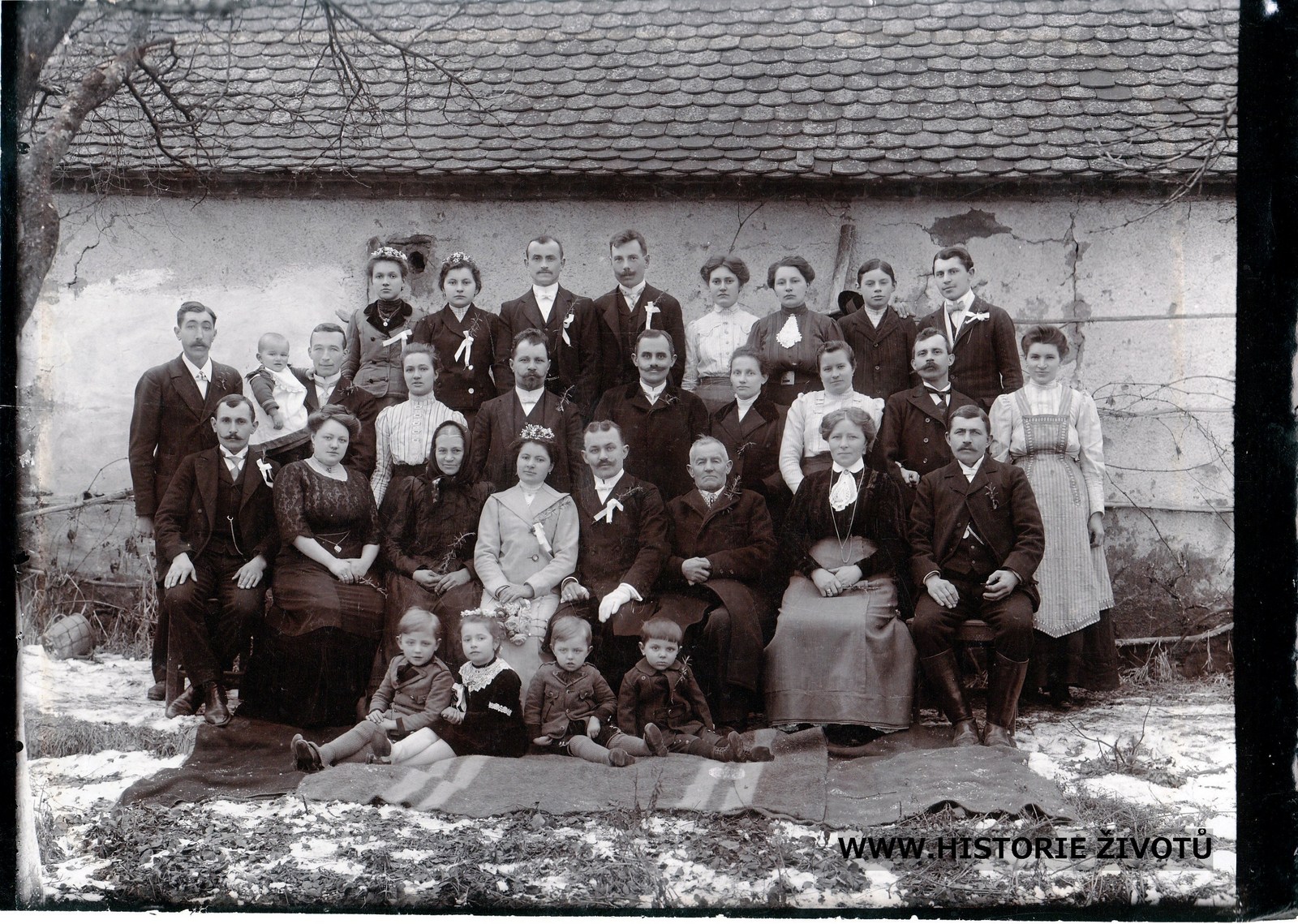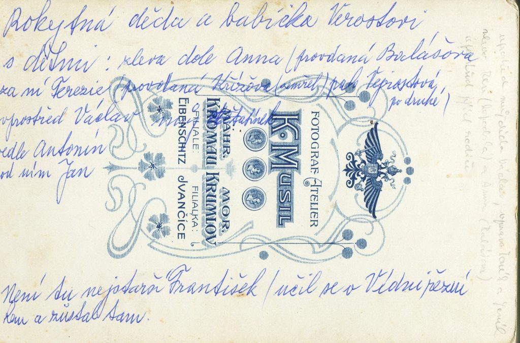 Popis fotografie: svatba Antonína Verosty (*1885)(bratr Václava *1875) a Anastasie Sobotkové (*1891). Vedle nevěsty její matka, dále Werosta Ewa a Franz (*1874)(další bratr Václava *1875) z Vídně. Vedle ženicha jeho otec Václav Verosta (*1844) z Rokytné. 2. řada: druhý zleva Leopold Baláš se synem Leopoldem, vedle jeho žena Anna roz. Verostová (*1888) z Rokytné, pátý zleva Václav Verosta (*1875) se ženou Karolinou (*1872) z MK, vedle Theresia Křížová (*1882, roz. Verostová, hospodská v Rokytné) a její muž Leopold Kříž. Vpředu děti: 1. a 3. zleva Franz a Otto Werosta z Vídně (synové Ewy a Franze).