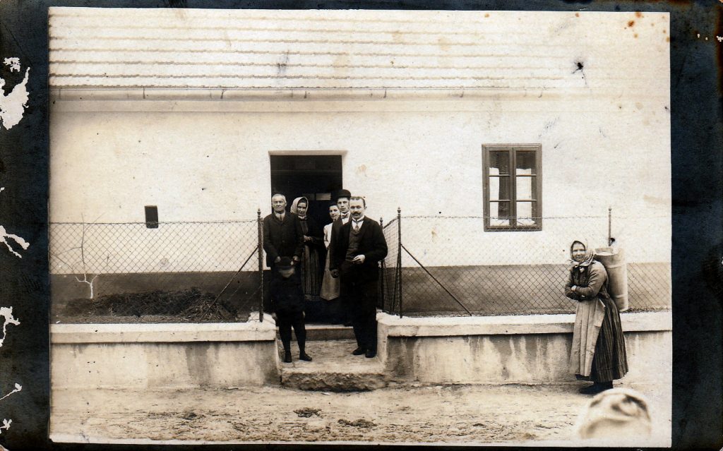 Popis fotografie: setkání příbuzných Václava Verosty (*1875) u příležitosti návštěvy jeho bratrance Bachela z Hanoveru, dole uprostřed bratři (zleva) Antonín (z Komárovic) a ? (z Hanoveru) Bachelové, bratranci Václava Verosty (*1875) z Moravského Krumlova (třetí zleva v horní řadě), vedle Václava vlevo jeho druhá žena Františka (1896-1976). Čtvrtá zleva v horní řadě Julie Verostová (rozená Košíčková z Rybníků, žena Václavova bratra Jana Verosty (*1891)), vedle František Vejrosta, druhý manžel Václavovy sestry Theresie (*1892), vedle další Václavova sestra Anna Balášová (*1888), dále syn René Bachel z Hanoveru a jeho dvě sestry. V první řadě je vlevo od Antonína Bachela jeho žena, drží v náručí jejich dítě (dalšími jejich dětmi jsou Marie-dívka se psem a syn stojící mezi bratry Bachelovými), další vlevo je sestra Antonína Bachela a nad ní její muž. Zcela vpravo je syn Anny Balášové Leopold. Vpravo od Bachela hanoverského by mohla být jeho žena.